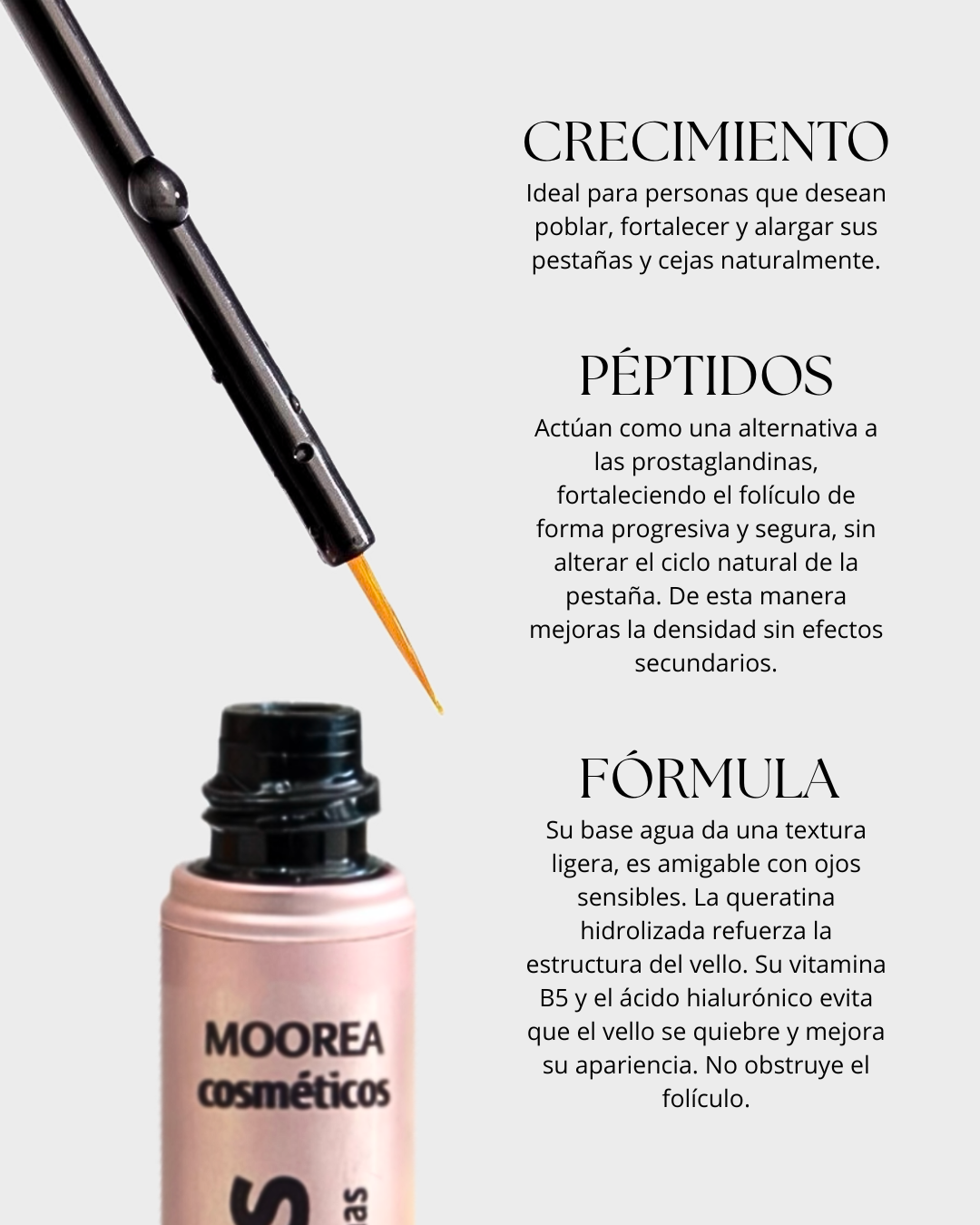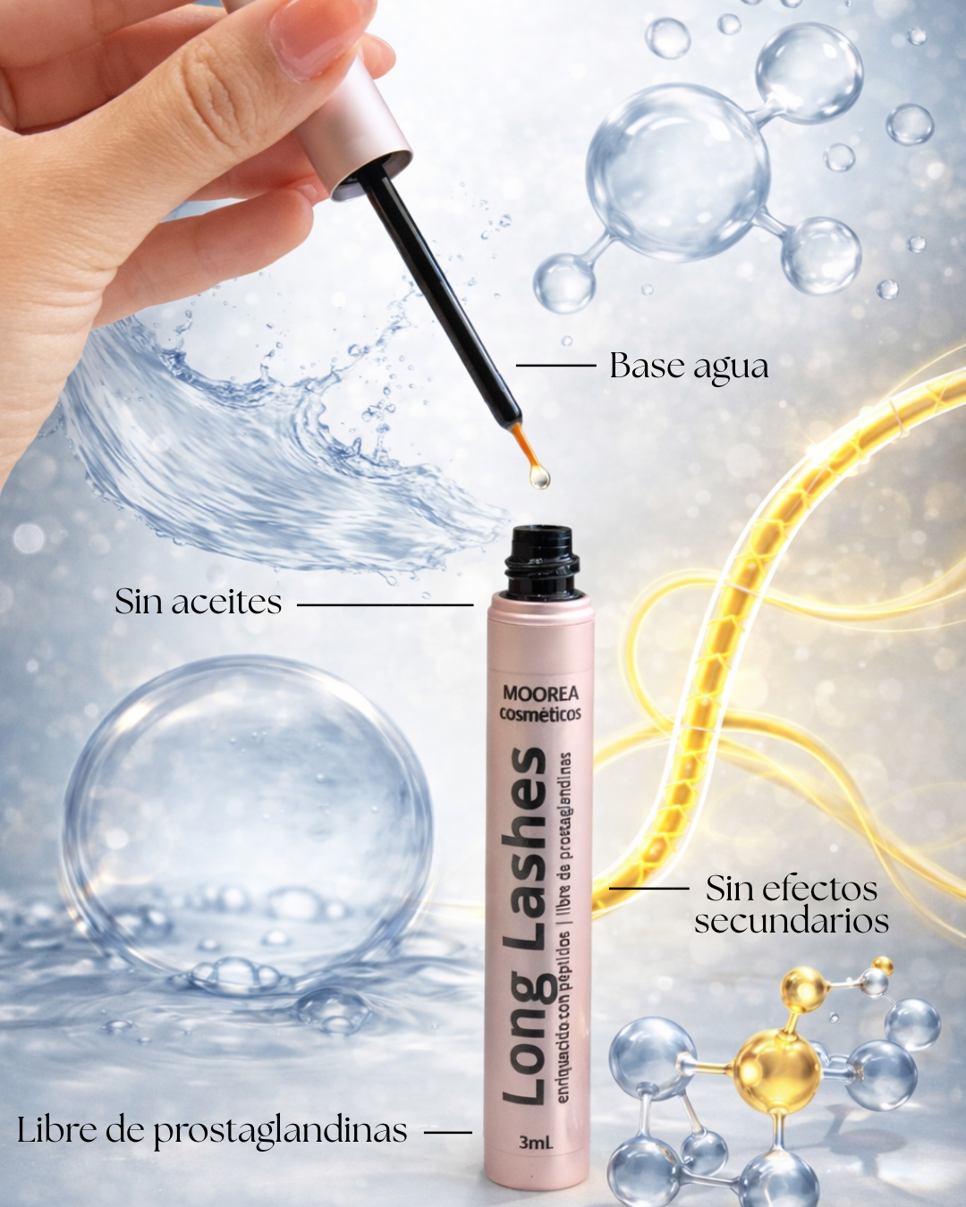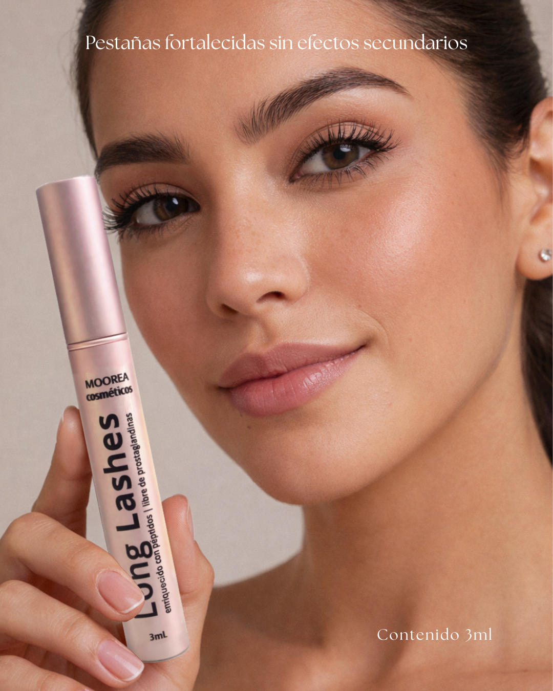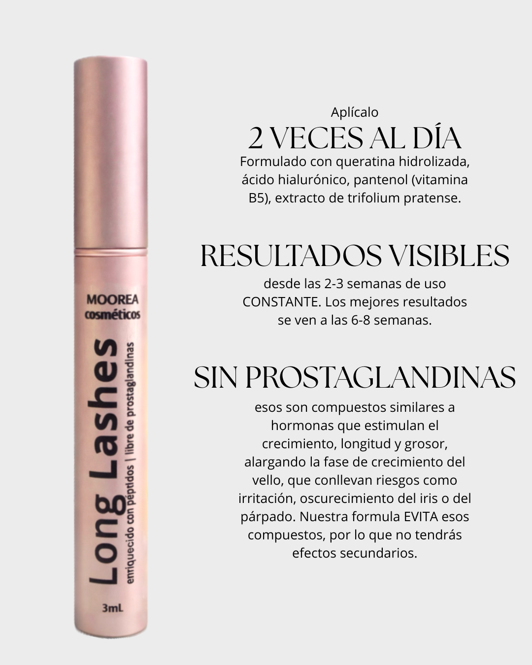 Suero de pestañas libre de prostaglandinas. Contenido 3ml. Aplicar dos veces al día con la piel limpia. Remover el exceso del pincel y aplicar en el nacimiento de las pestañas superiores en ambos ojos y en cejas.